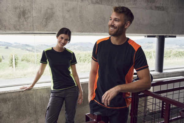 T-shirt met contrasterende panelen voor betere zichtbaarheid. Gemaakt van katoen en gerecycled polyester. Afgewerkt met contrasterende stiksels, rib in de kraag, verstevigde necktape en gemakkelijk te verwijderen label voor rebranding.
