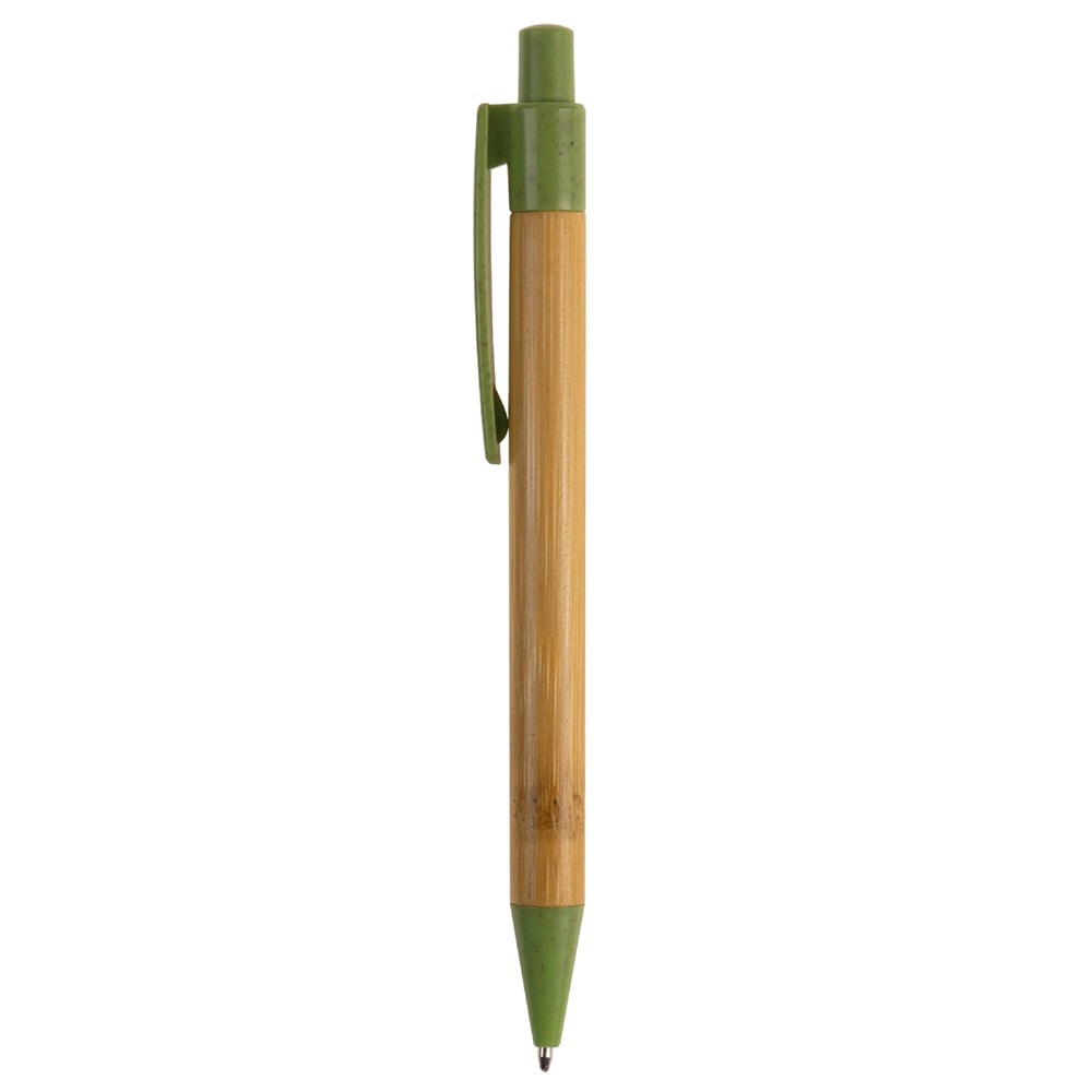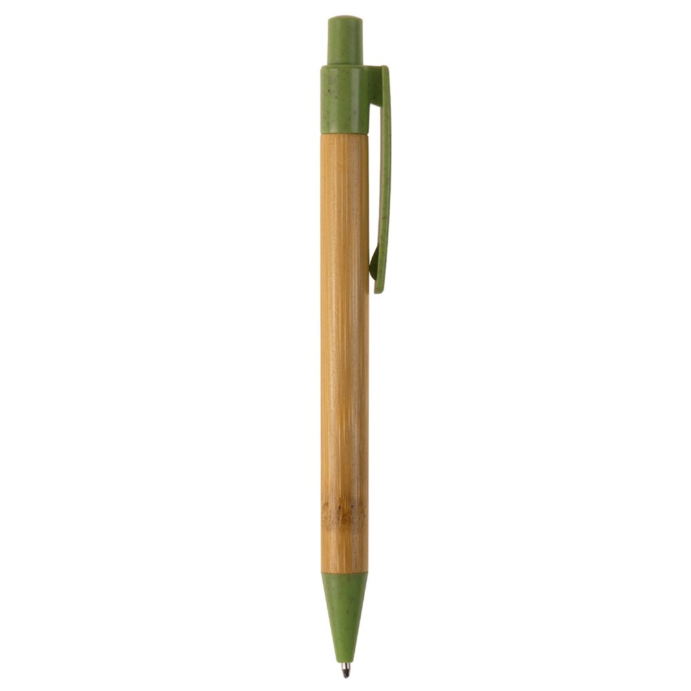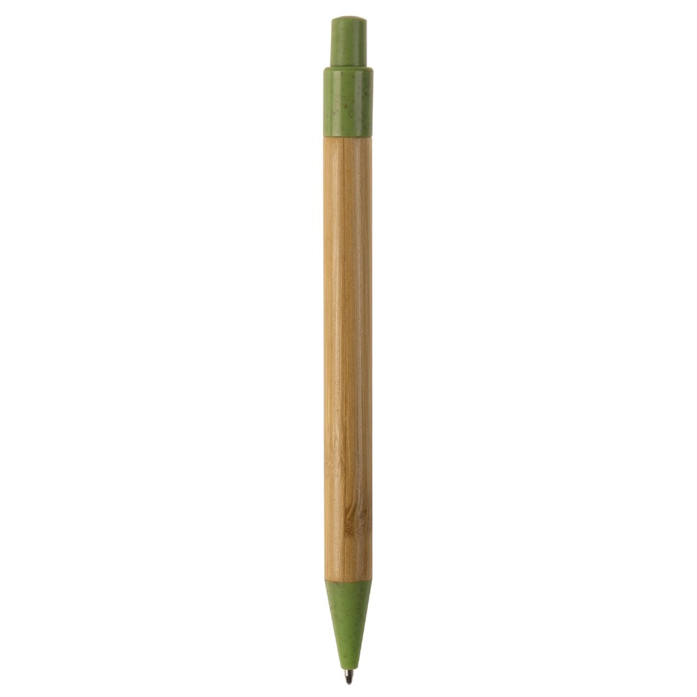 Balpen van bamboe materiaal met een clip, drukker en punt gemaakt van tarwestro. Bevat een kunststof blauwschrijvende X20 vulling.