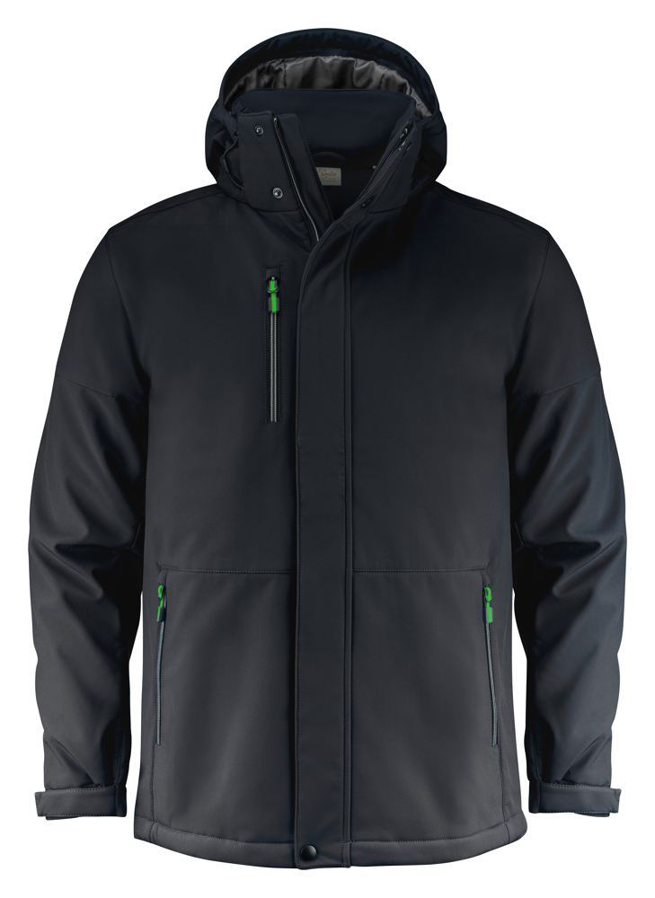 Gevoerde softshell jas met afneembare capuchon en stormflap met drukknopen. Aanpasbare mouwen met velcrosluiting en trekkoorden aan de capuchon en de zoom. 2 binnenzakken met ritssluitingen. Reflecterende piping op de rug. Uitscheurbaar neklabel en afzonderlijk geweven maatlabel. Aan de binnenzijde van de linkerzijnaad werd een zakje voorzien voor het innaaien van een waschip. De zippullers kunnen indien gewenst vervangen worden door één van de andere beschikbare kleuren. Oeko-Tex 100 gecertificeerd.