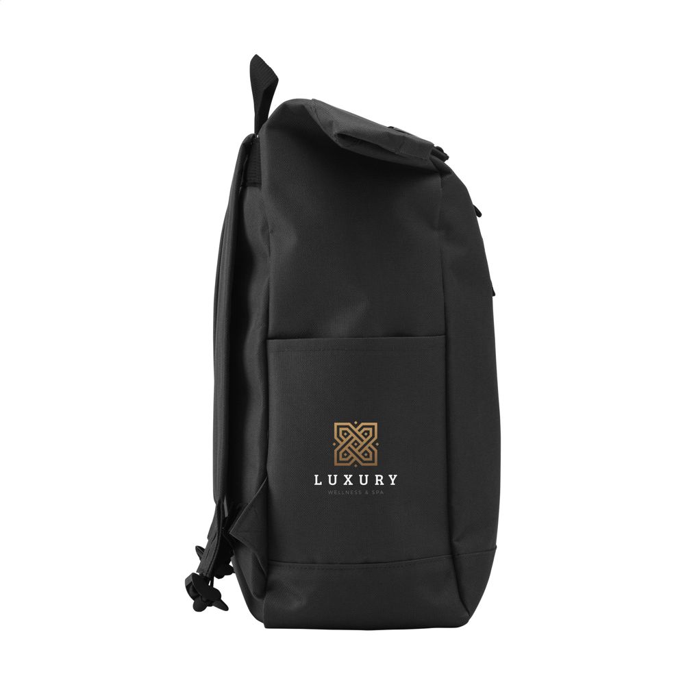 Stoere, praktische urban ‘roll-top’ rugzak van sterk 600D polyester met waterbestendige PVC binnenzijde, gedeeltelijk nylon gevoerd. De rugzak heeft één groot binnenvak, een insteekvak aan beide zijdes en een groot ritsvak aan de voorzijde. Met foam rugzijde voor meer draagcomfort, gewatteerde, en verstelbare schouderriemen. Met draaglus en een rolsluiting met kliksysteem aan de bovenzijde. De perfecte tas voor dagelijks gebruik. Inhoud ca. 18 liter.