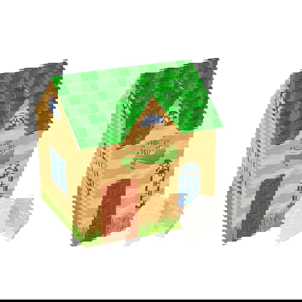 Huisvormig doosje all-over full colour bedrukt, gevuld met ca. 45 gram pepermuntjes in de vorm van een huisje
