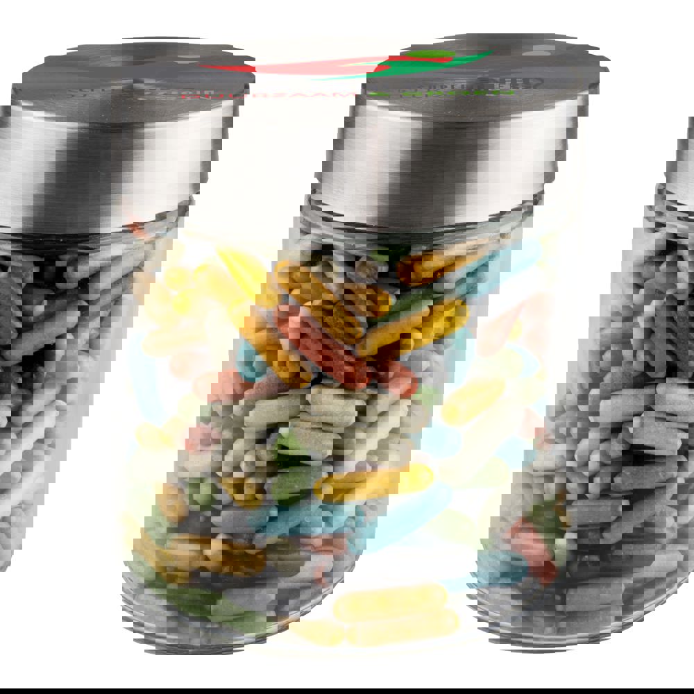 Glazen pot met RVS deksel 0,9 liter voorzien van een full colour digitale bedrukking op het deksel en gevuld met Dropstaafjes mix