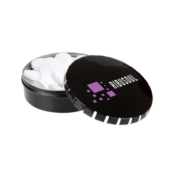 Clic-clac blikje zwart met ca. 50 gram Compli'mints pepermunt en voorzien van een full colour bedrukking. Inclusief ingrediëntensticker en seal.