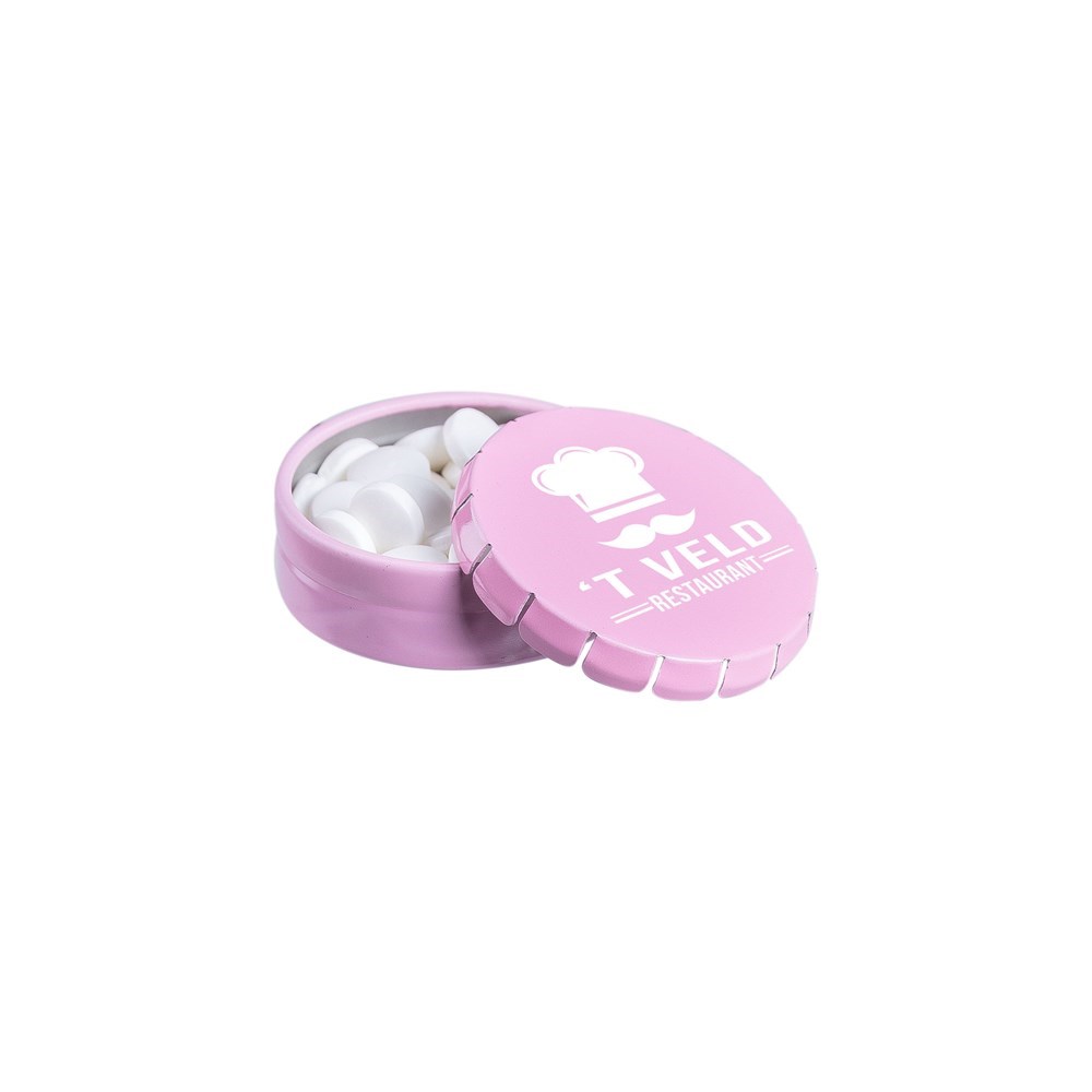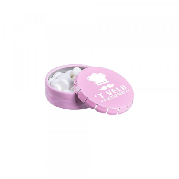 Super mini clic-clac blikje roze met ca. 12 gram pepermunt en voorzien van een full colour bedrukking. Inclusief ingrediëntensticker en seal.