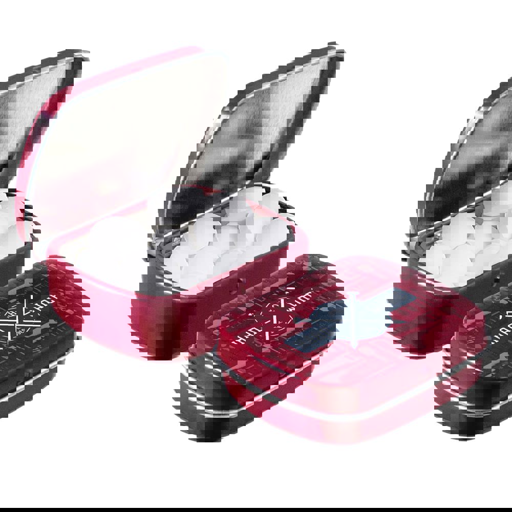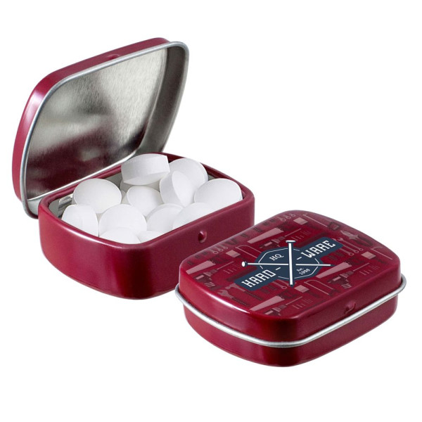 Micro scharnierblikje wijnrood met ca. 9 gram Druivensuiker mint bolletjes en voorzien van een full colour bedrukking. Inclusief ingrediëntensticker en seal.