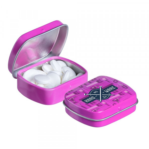 Micro scharnierblikje fuchsia met ca. 9 gram pepermunt en voorzien van een full colour bedrukking. Inclusief ingrediëntensticker en seal.