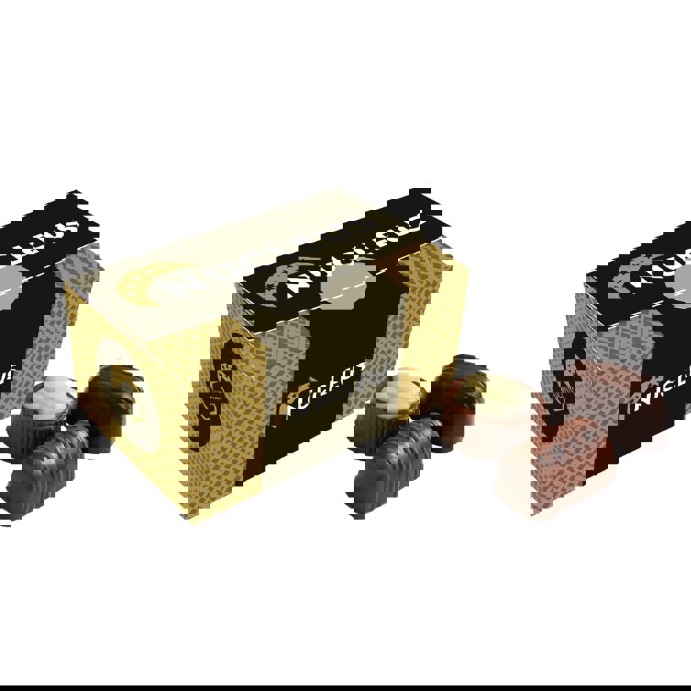 Ballotin doosje voorzien van een all-over full colour bedrukking en gevuld met 12 heerlijke Belgische chocolade bonbons