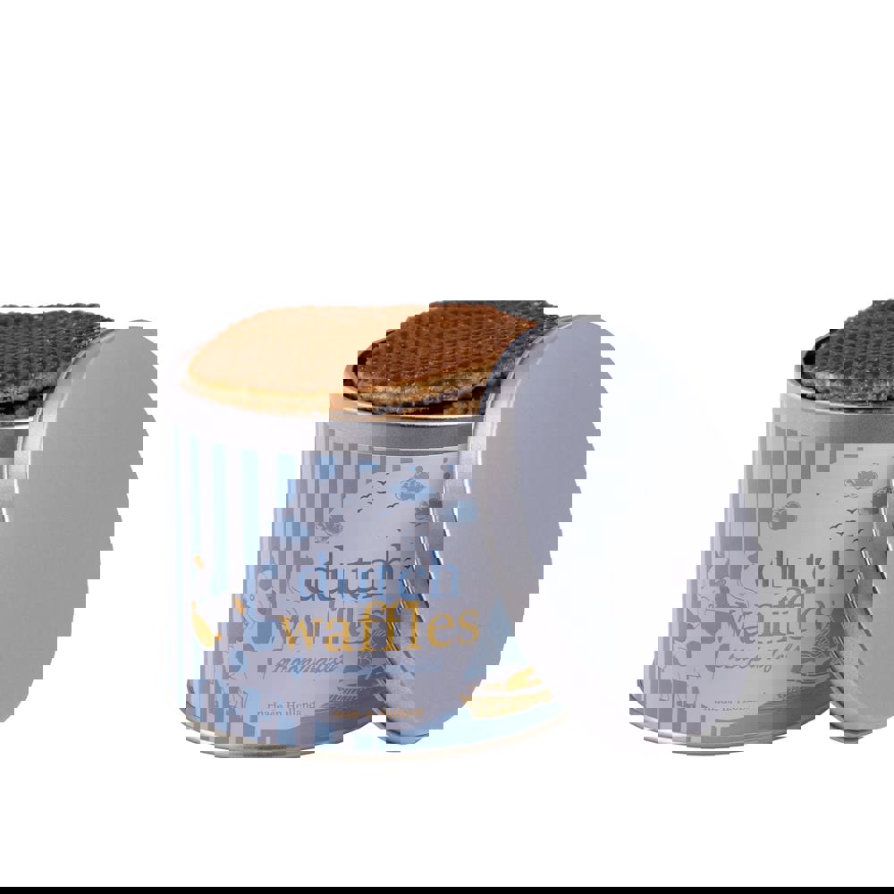 Blik gevuld met 8 roomboter stroopwafels, in folie verpakt en voorzien van een rondom geplakte full colour bedrukte sticker