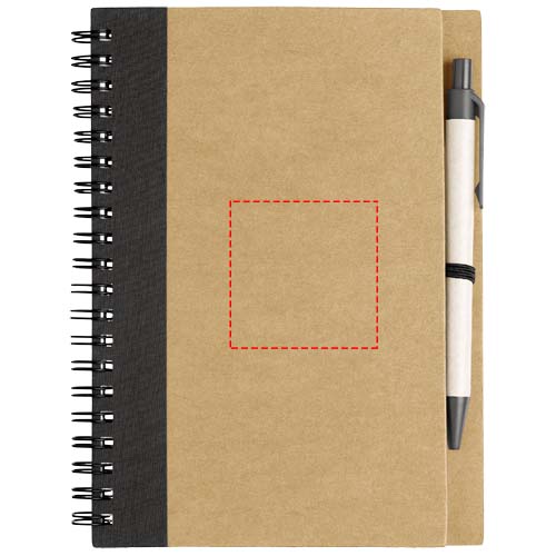 Notitieboek met omslag van gerecycled papier met 60 vellen gerecycled lijntjespapier en bijpassende pen. Notitieboek en pen samen verpakt.