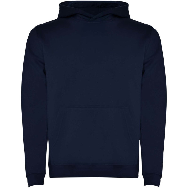 Tweekleurige hoodie met dubbele stof. Versterkte bedekte naden in de kraag en kangoeroezak. 1x1 elastaan rib in manchetten en tailleband. Verwijderbaar etiket. Het model is 120 cm en draagt maat 5/6.