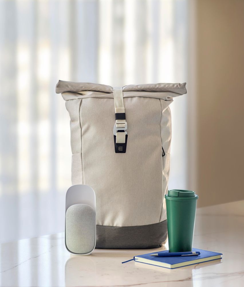 rPET (600D) roll-top rugzak met een groot vak met rits aan de bovenkant en een groot vak met rits aan de voorkant. De rugzak heeft verstelbare banden en een plastic gesp voor de roll-top sluiting.