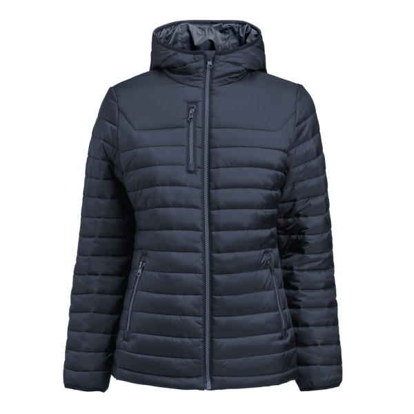 De Meadows gewatteerde jas met vaste capuchon is gemaakt van ripstop buitenstof, vervaardigd uit gecertificeerd gerecycled polyamide. Het moderne ontwerp omvat twee zijzakken met ritssluiting en een borstzak met ritssluiting voor handige en veilige opslag. De voorpas maakt eenvoudige personalisatie mogelijk. De elastische afwerking aan de mouwen zorgt voor een nauwsluitende pasvorm, terwijl de verstelbare zoom met elastisch trekkoord zorgt voor aanpasbaar comfort. Daarnaast heeft de jas binnenin een opgestikte zak met klittenband.