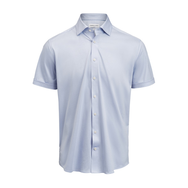 The Knit Interlock Oxford Short Sleeved Shirt. It has soft modern cut away hidden button down collar, side splits and fold up sleeves. A comfortable knitted Easy Care-treated modern business classic with natural stretch performance and tone-in-tone details.