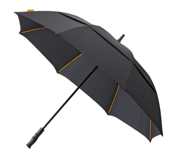 GP-76 FALCONE hoge kwaliteit windproof golfparaplu, automaat. Hoogwaardig oranje glasfiber frame. 210T polyester pongee doek met overlappende panelen om de wind door te laten. Zwart rubber finished handvat, met een opening aan de onderkant om uw eigen doming toe te voegen en met een foedraal.