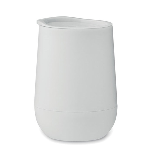 Dubbelwandige beker van PP met een schuifdeksel met drinkopening in PS en ABS. Inhoud: 300ml.
