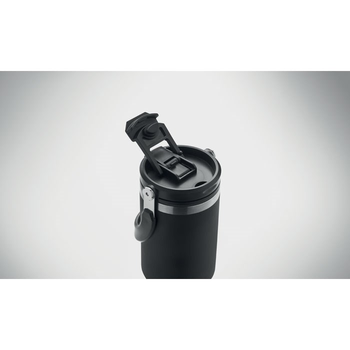 Dubbelwandige gerecyclede roestvrijstalen beker (90% gerecycled roestvrij staal en 10% roestvrij staal) met deksel met ingebouwd rietje, uitklapbaar mondstuk en directe drinkopening. Inhoud 850ml.