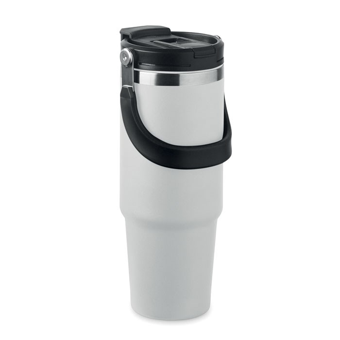 Dubbelwandige gerecyclede roestvrijstalen beker (90% gerecycled roestvrij staal en 10% roestvrij staal) met deksel met ingebouwd rietje, uitklapbaar mondstuk en directe drinkopening. Inhoud 850ml.