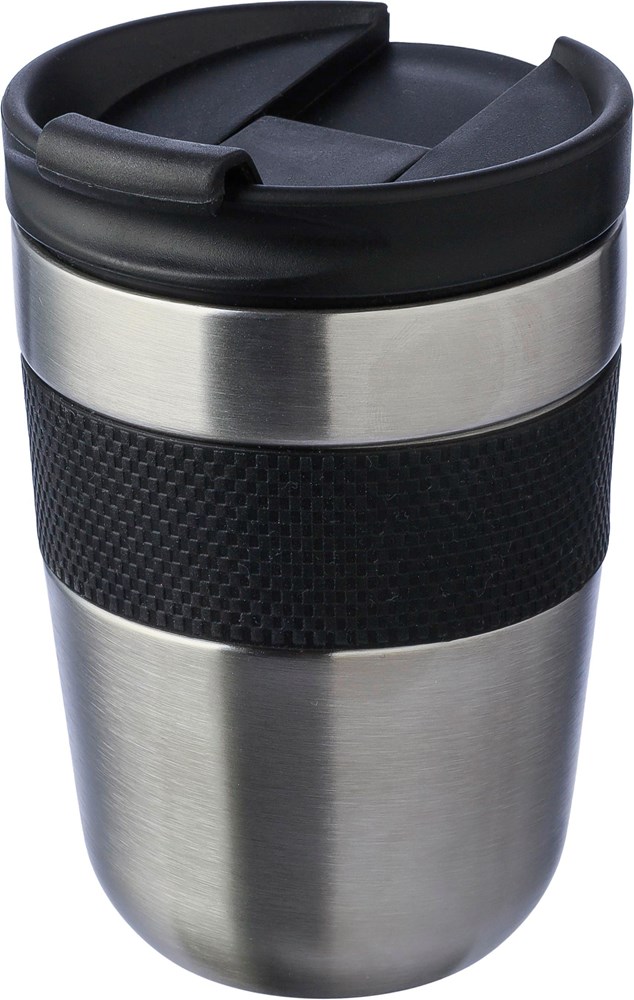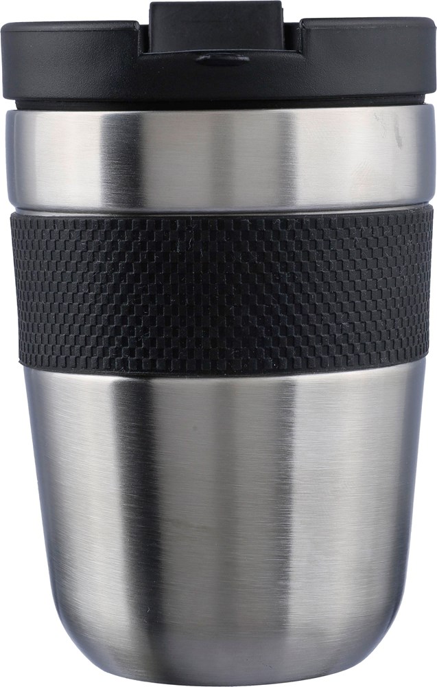 Roestvrijstalen dubbelwandige drinkbeker (300 ml) met een PP-deksel en siliconen grip. Houdt de inhoud 4 uur warm en 6 uur koud. De binnenkant is van roestvrij staal 304 en de buitenkant van roestvrij staal 201. Per stuk verpakt in een bruin kartonnen doos.