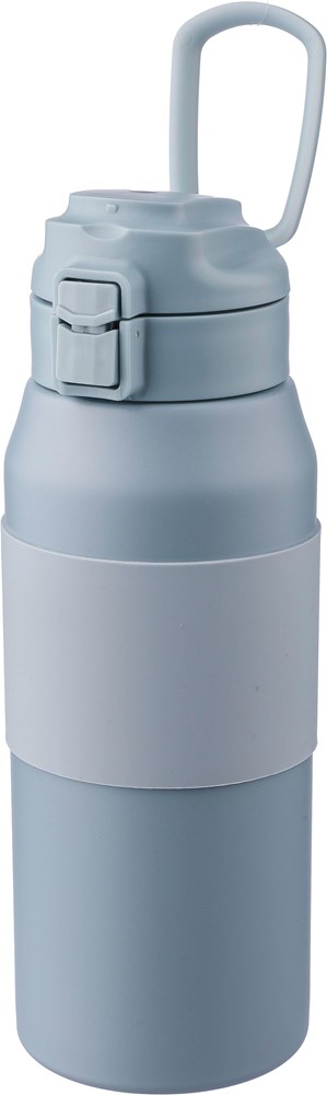 Roestvrijstalen dubbelwandige drinkfles (800 ml) met een siliconen grip op de behuizing, drinktuit, PP-dop en draaghandvat. Gemaakt van roestvrij staal 304. Drukknop om de drinktuit te openen of te sluiten. Houdt de inhoud 8 uur warm en 12 uur koud. Per stuk verpakt in een bruin kartonnen doos.