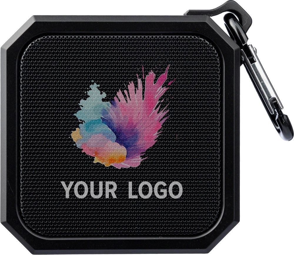 Gerecycled ABS luidspreker met karabijnhaak en plastic clip. IPX4-gecertificeerd. 3W output, DC 5V input, 300mAh ingebouwde oplaadbare batterij, met 2 uur speeltijd. Werkafstand van 15-20 meter, signaal-ruisverhouding van 87 dB. Frequentiebereik: 100 Hz tot 20 kHz. Inclusief 50 cm Type-C oplaadkabel. Draadloze verbindingstechnologie: 5.2. Per stuk verpakt in een bruin kartonnen doos.