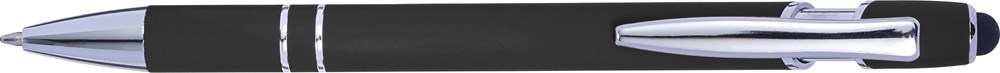 Balpen met rubberen toplaag en stylus. De tip en clip zijn van zilverkleurige kunststof. Blauwschrijvend.
