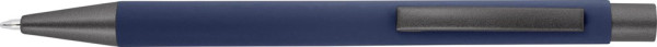 Balpen met rubberen toplaag. De tip, top en clip hebben een donkergrijze kleur. De onderlaag is zichtbaar bij laser graveren. Blauwschrijvend.