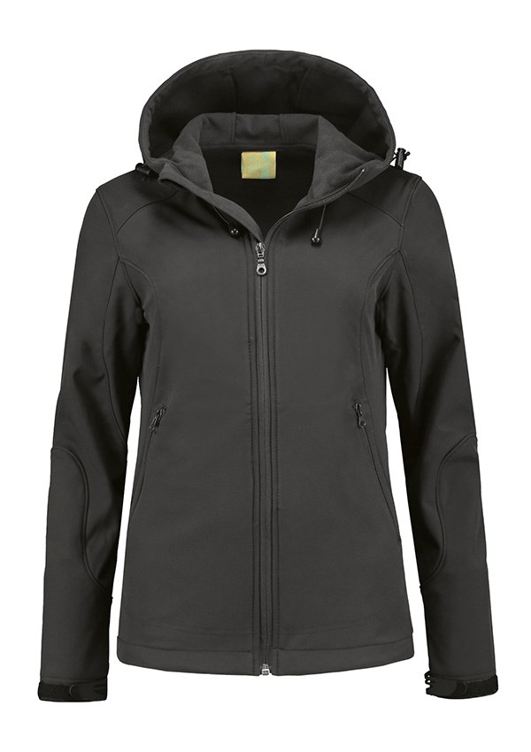 Lemon & Soda softshell jack voor dames met capuchon en twee zakken met rits van een hoogwaardige kwaliteit. Softshell is te borduren en hierdoor is het jack in te zetten als gepersonaliseerde promotiekleding of bedrijfskleding.
