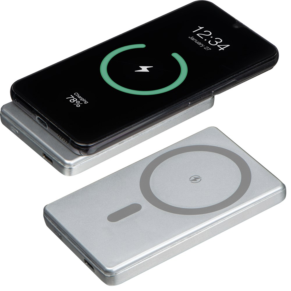 Magsafe® 5.000 mAh van gerecyceld aluminium voor draadloos opladen tot 10 Watt. Door de geïntegreerde magneten klikt dit apparaat aan uw IPhone en zorgt voor snel en draadloos opladen. Compatible vanaf IPhone 12. Voor andere QI-geschikte modellen kan het als een draadloos laadstation gebruikt worden. Uw logo wordt op de achterzijde gegraveerd.