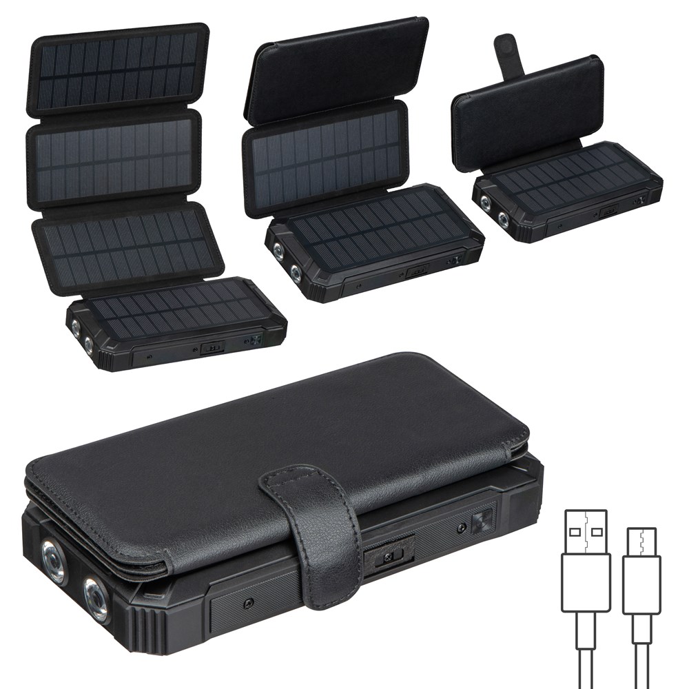 Krachtige solarpowerbank van 20.000 mAh met vier uitklapbare solarpanelen. Uw logo wordt buiten op de hoes gedrukt.