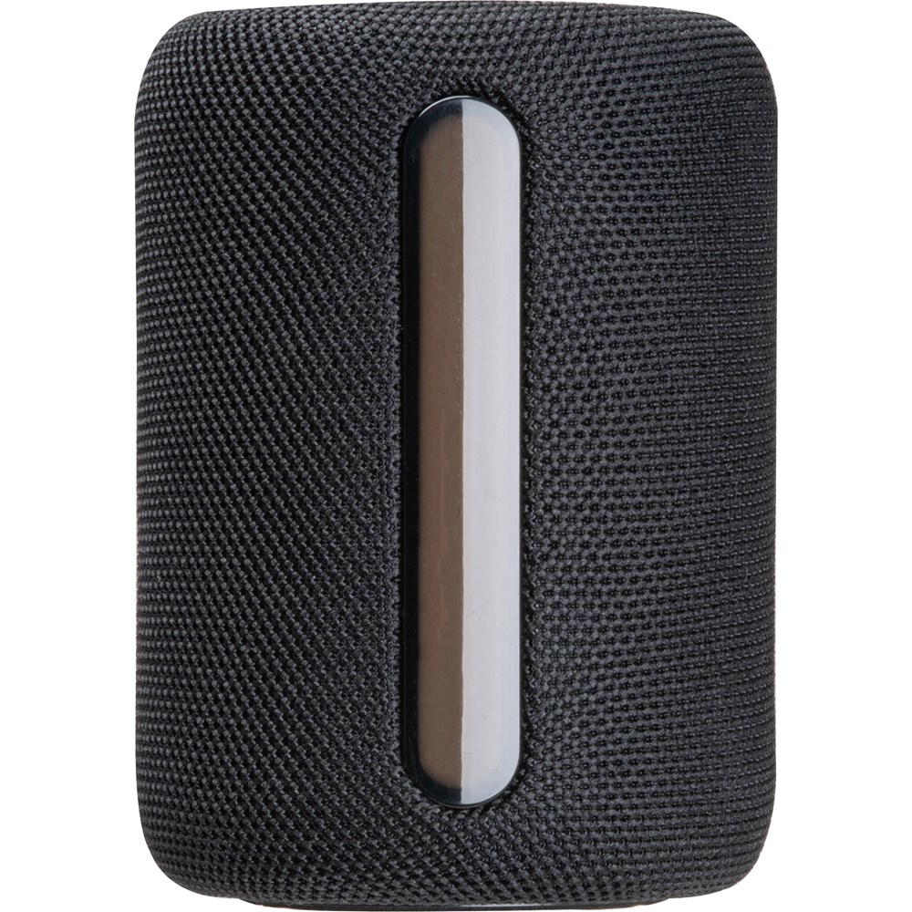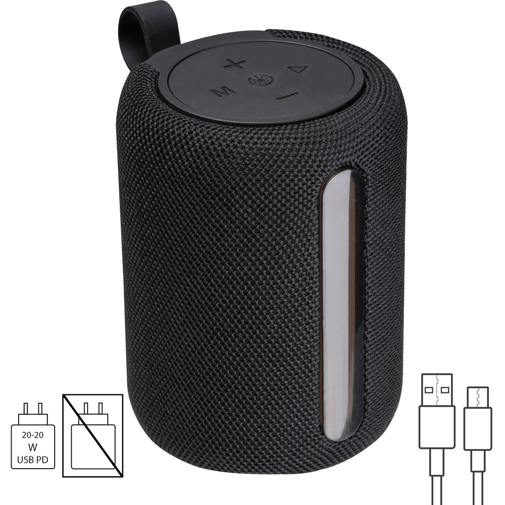 Ronde Bluetooth luidspreker (vrsie 5.3), 800 mAh (5V) met RGB-LED verlichting en laadkabel, USB-C aansluiting, SD aansluiting en een klein draagriempje. Uw logo wordt op de bovenzijde met rubberfinish gegraveerd.