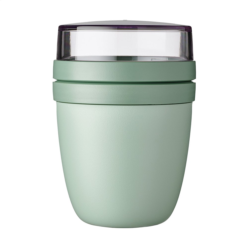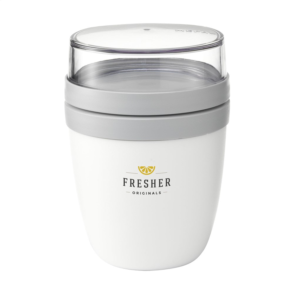 Deze kunststof foodjar van het merk Mepal is een handig product om je lunch of tussendoortje mee te nemen. De foodjar heeft twee compartimenten. Door middel van een draaibeweging scheid je de twee compartimenten van elkaar. Beide delen hebben een aparte deksel. Dé oplossing om geknoei tijdens het mengen te voorkomen. De inhoud van het bovenste transparante compartiment is 200 ml, dit betekent dat er ongeveer 75 gram muesli of fruit in past. De inhoud van het onderste compartiment is 500 ml, genoeg voor een royale portie soep, noedels of yoghurt. Een hoogwaardig kwaliteitsproduct. Food Approved en lekvrij. Geschikt voor magnetron (deksel uitgezonderd) en vriezer. Met 2 jaar Mepal fabrieksgarantie. Made in Holland. VOORRAAD INFORMATIE: Tot 1.000 stuks beschikbaar binnen 10 werkdagen. Uitzonderingen voorbehouden. Per stuk verpakt.