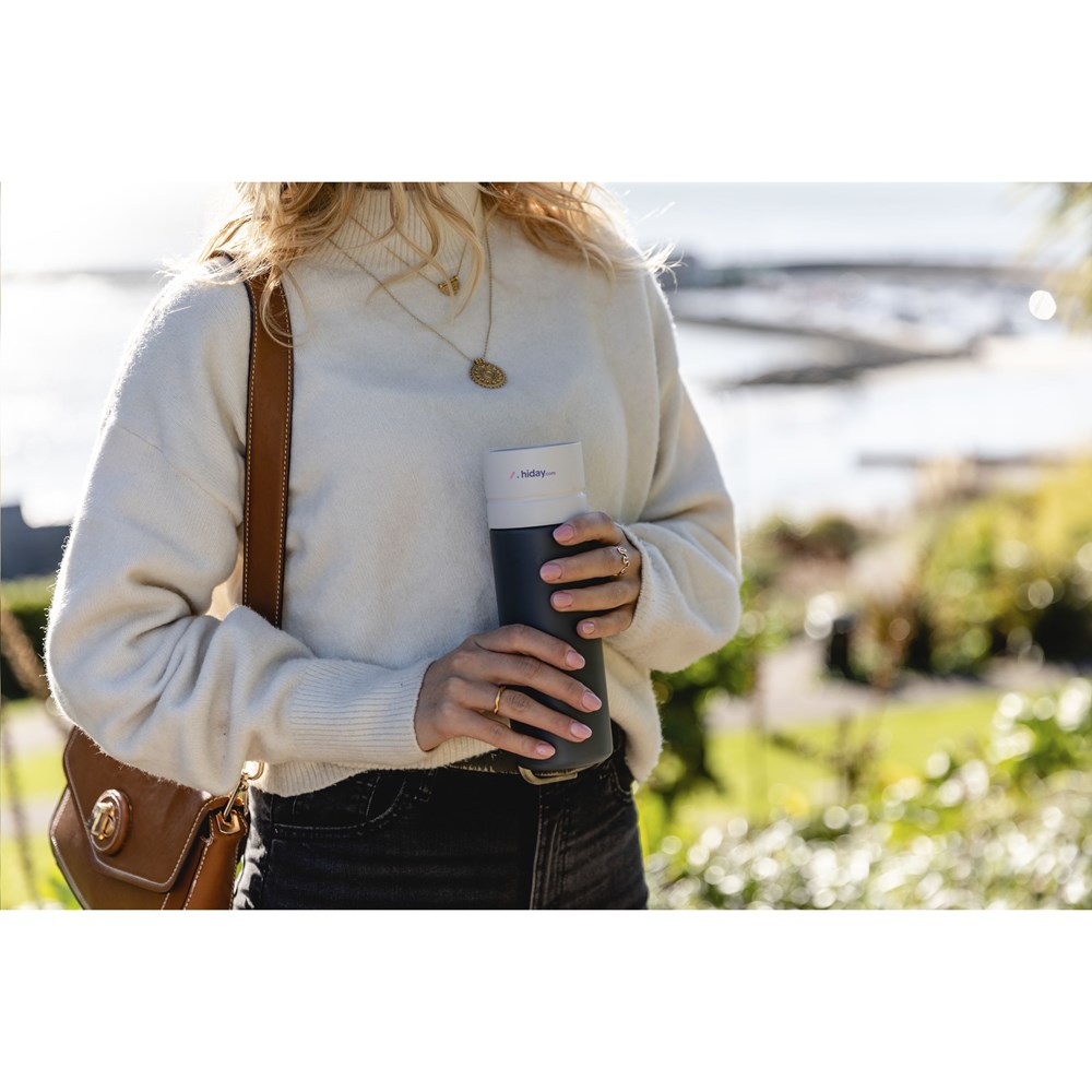 Circulaire waterfles van Circular&Co. Deze fles is voor 92% gemaakt van 14 gebruikte en gerecyclede PET-flesjes. De schroefdop is ontworpen met een gepatenteerde 360-graden technologie, waarmee je vanuit elke hoek kunt drinken. Deze push-click-dop kun je met één hand en één klik openen en sluiten. Ideaal voor onderweg. De fles is superlicht in gewicht, 100% recyclebaar en 100% lekvrij. Niet geschikt voor warme dranken. Enkel het deksel is vaatwasserbestendig, alleen in de bovenste lade van de vaatwasser. Inhoud 600 ml. EXTRA INFO: Bij een minimale afname van 5.000 stuks is het deksel van dit product verkrijgbaar in elke PMS-kleur. Zo creëer je een perfecte match tussen product en opdruk.
