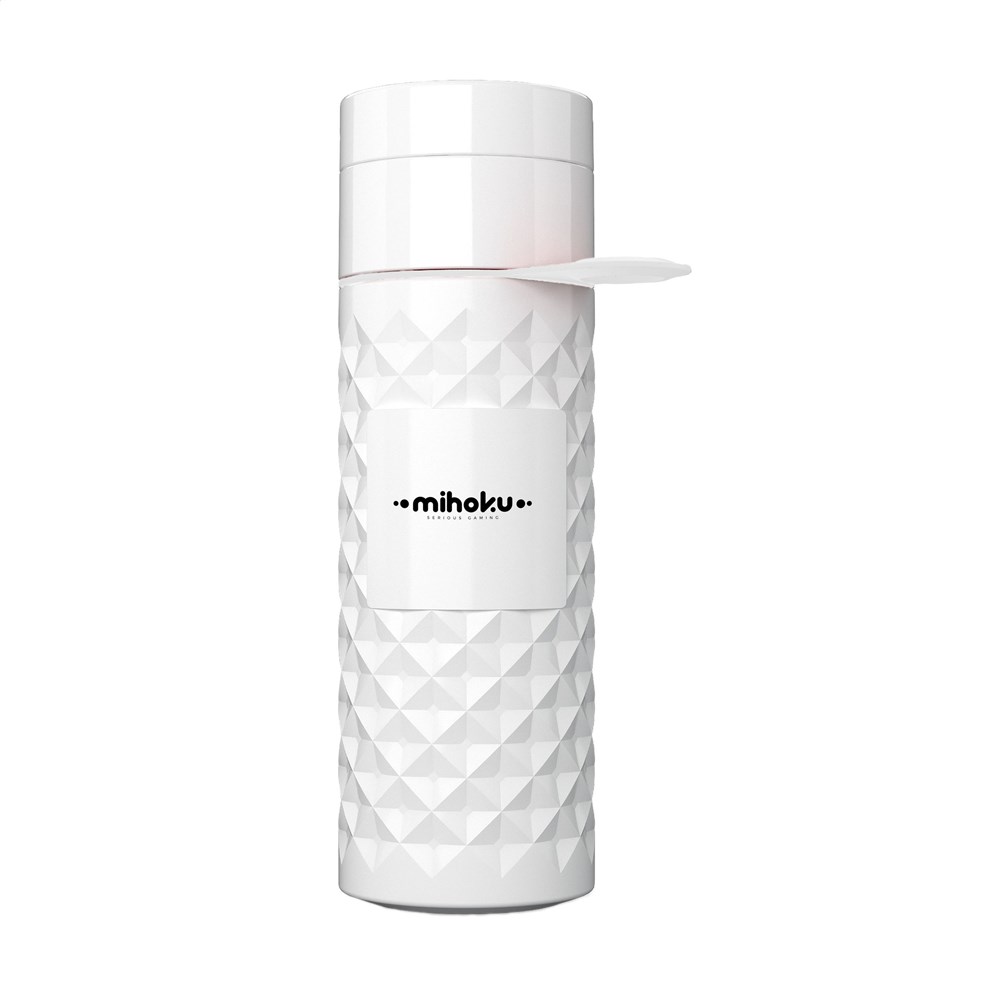 Herbruikbare waterfles van het merk Join The Pipe. Deze fles is gemaakt van Bio HDPE. Deze kunststof wordt gemaakt van het afval van de suikerrietplant. Het fraaie 3D diamantpatroon geeft de fles een opvallend fraaie uitstraling. De fles heeft 2 openingen met schroefdop: een drinkopening en een royale opening voor het gemakkelijk schoonmaken van de fles of het toevoegen van ijsblokjes. Met handige, rubberen draaglus. Lekvrij. Vaatwasserbestendig tot 65°C. Voor behoud van de opdruk wordt met de hand afwassen aanbevolen. Inhoud 500 ml. Made in Holland.