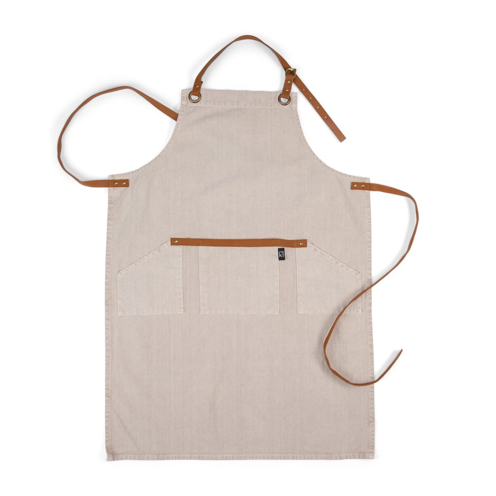 Schort van puur katoen met verstelbare band in de nek en drie zakken in de taille. Riemen en details in PU-leder.