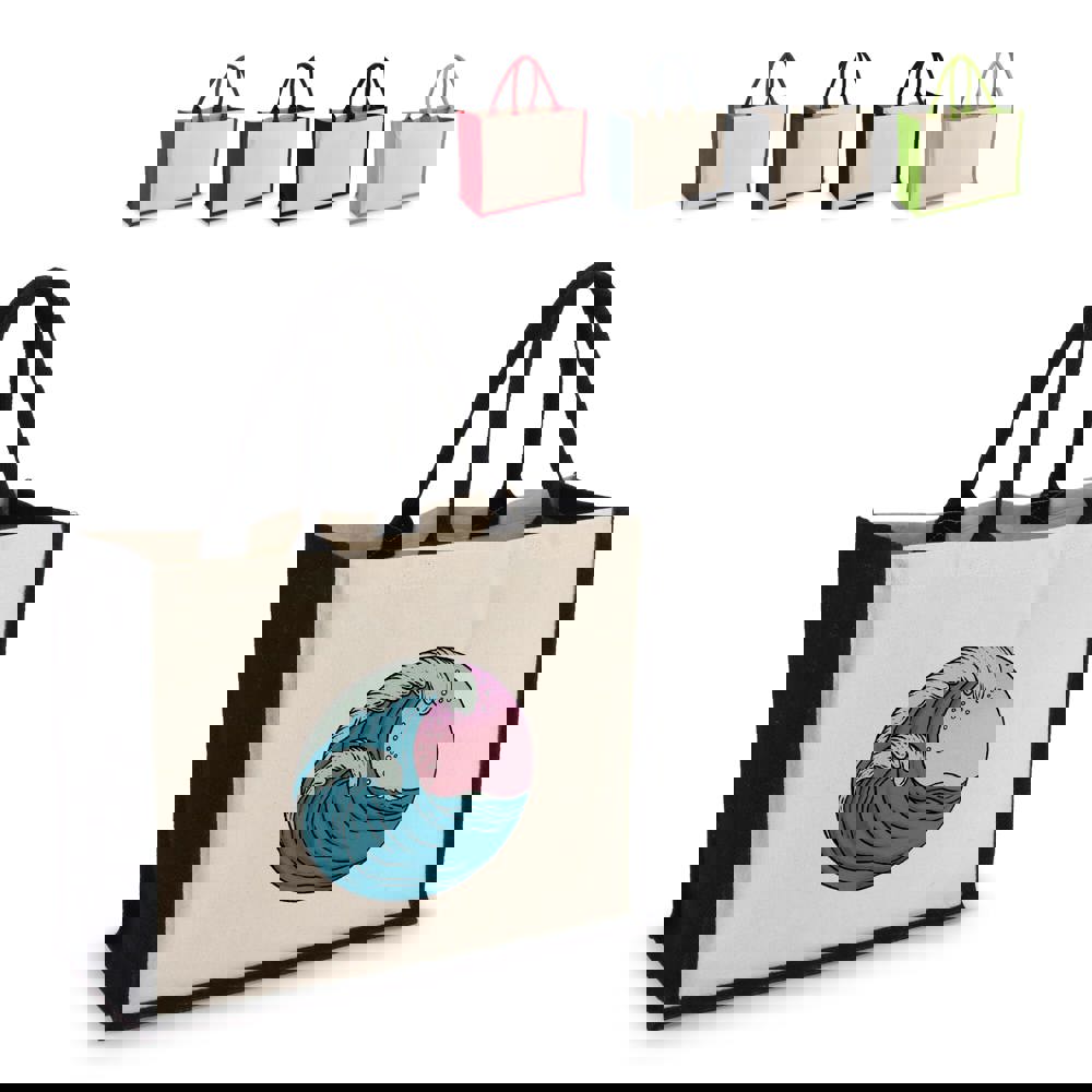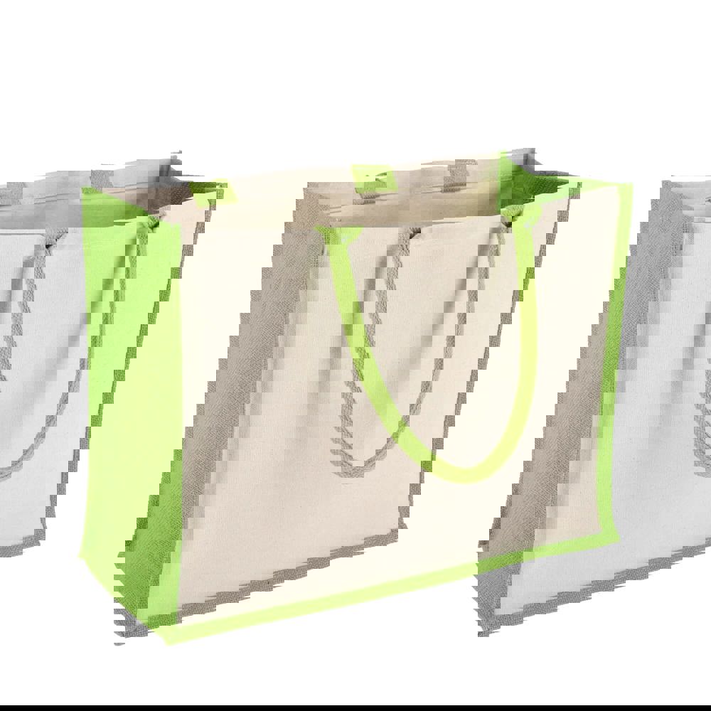 Stijlvolle tas met katoenen canvas voor- en achterpanelen en jute zijkanten en bodem – alles 320gsm. Afgewerkt met katoenen handvatten en zijkanten in accentkleuren voor een opvallende uitstraling. Oeko-Tex® gecertificeerd. Ideaal voor retail, events of dagelijks gebruik.