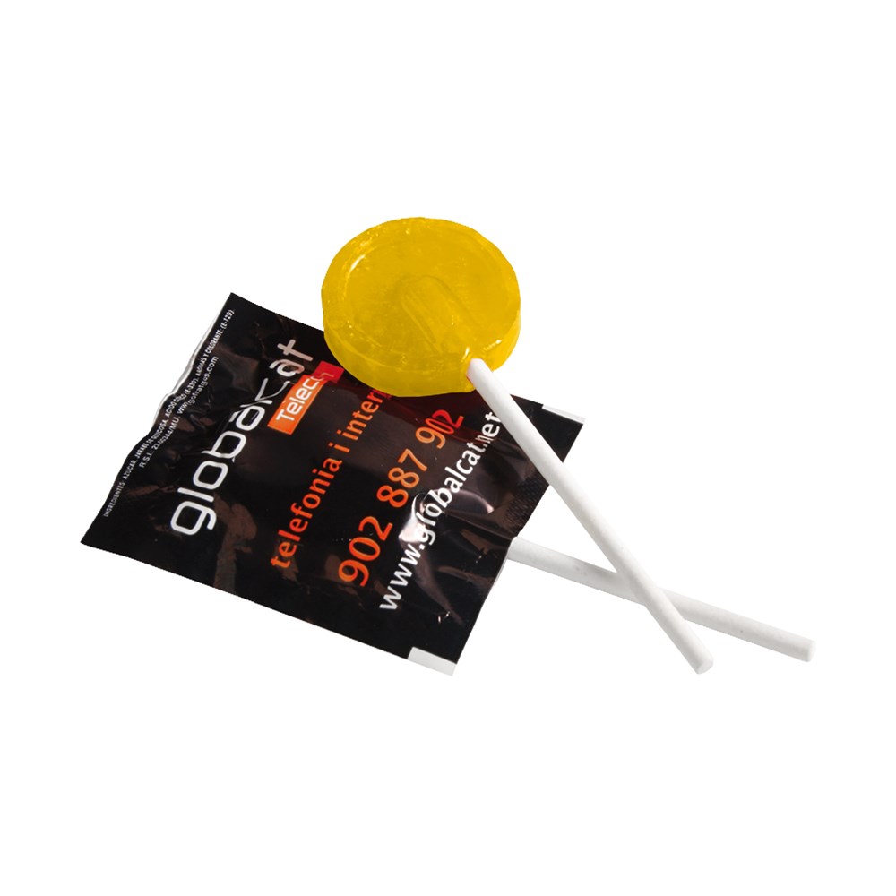Platte lolly van ca. 5,5 gram in witte folie, met citroen smaak, voorzien van een all-over bedrukking aan de voorzijde. De achterzijde wordt repeterend bedrukt of is transparant