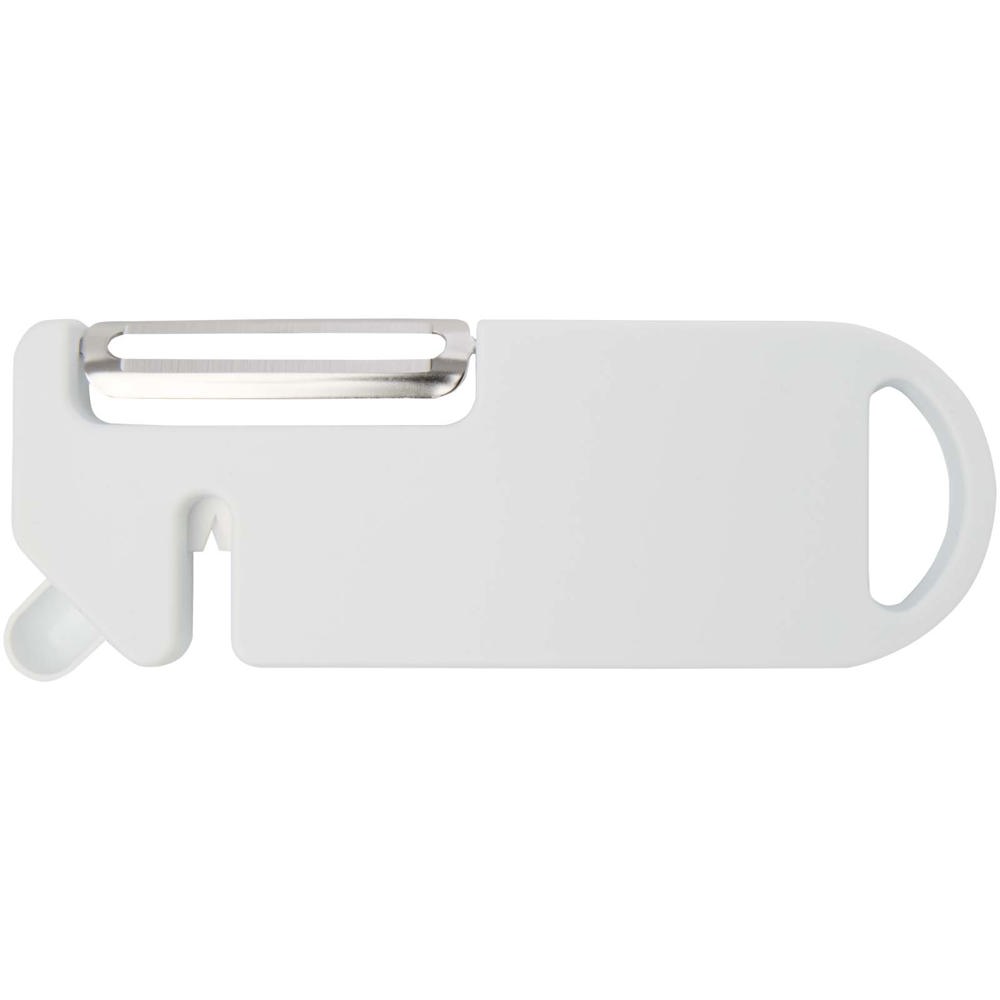 Dit multifunctionele keukengereedschap combineert vier essentiële functies in één compact ontwerp. Gemaakt van gerecycled plastic en voorzien van een dunschiller, flesopener, messenslijper en een puntig uiteinde voor het verwijderen van aardappelvlekjes. Een ingebouwd ophanggat maakt opbergen eenvoudig. Praktisch en ruimtebesparend, een veelzijdige must-have voor elke thuiskok.