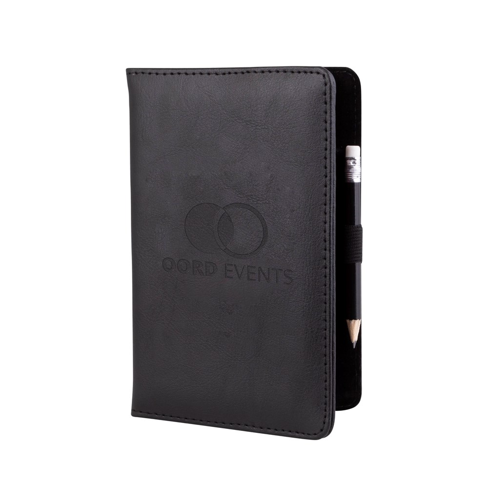 Lederen scorekaart houder voorzien van een embossing inclusief zwart potlood met gum, formaat 11 x 17,5 cm