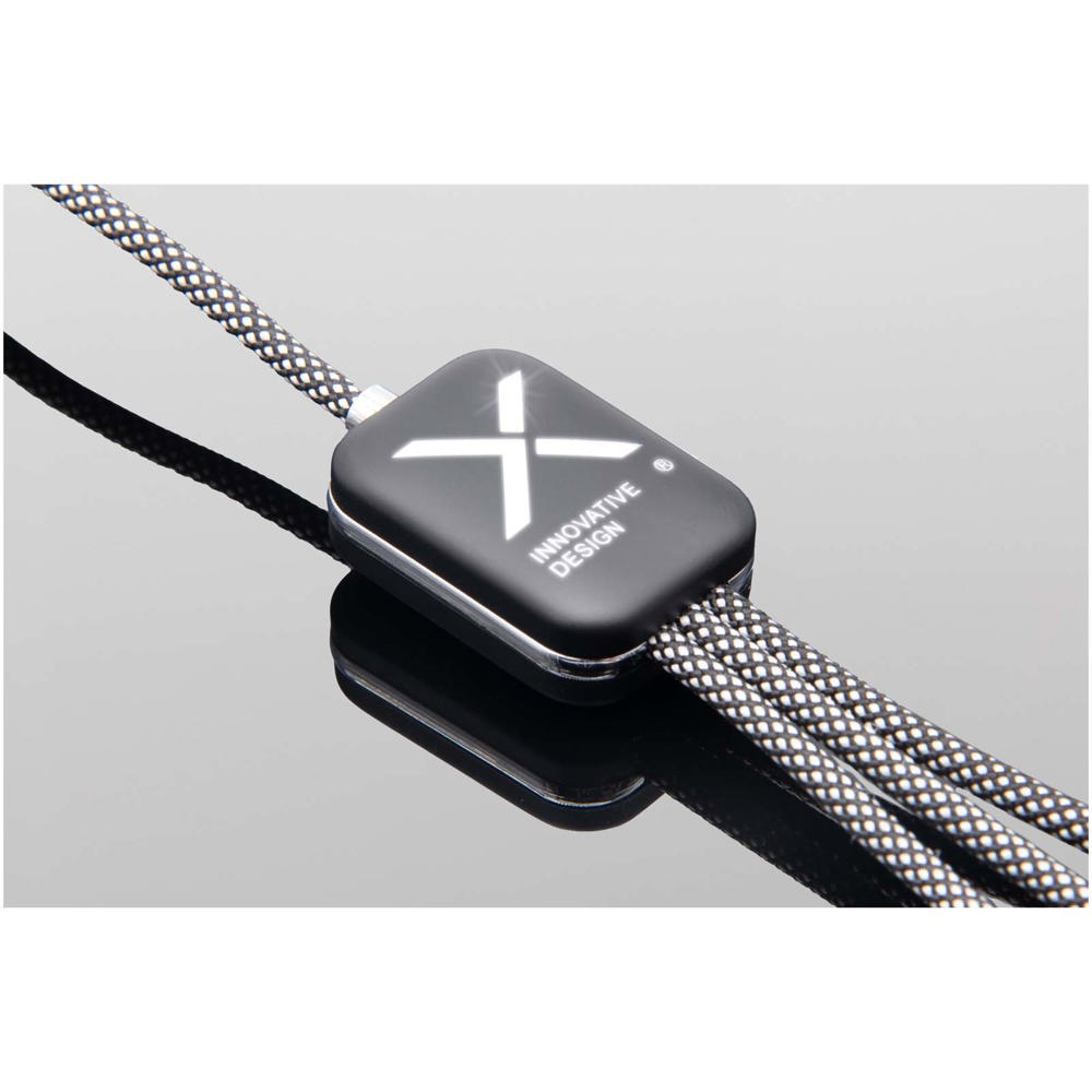 Deze 1-meter 60W-oplaadkabel heeft een stijlvolle rubber- en metalen afwerking, snoeren gemaakt van gerecyclede plastic flessen en dubbele verlichte logo’s – elk aanpasbaar en optioneel verschillend. Voorzien van drie connectoren (2 × Type-C en 1 × Lightning) kan hij twee of drie apparaten tegelijk opladen. De dubbele USB-A- en USB-C-ingang zorgt voor volledige compatibiliteit met de nieuwste computers, inclusief USB-C-modellen. De kabel biedt dubbelzijdige personalisatie en wordt geleverd in een recyclebare TPU-sleeve met een gerecycled papieren achterkaart.