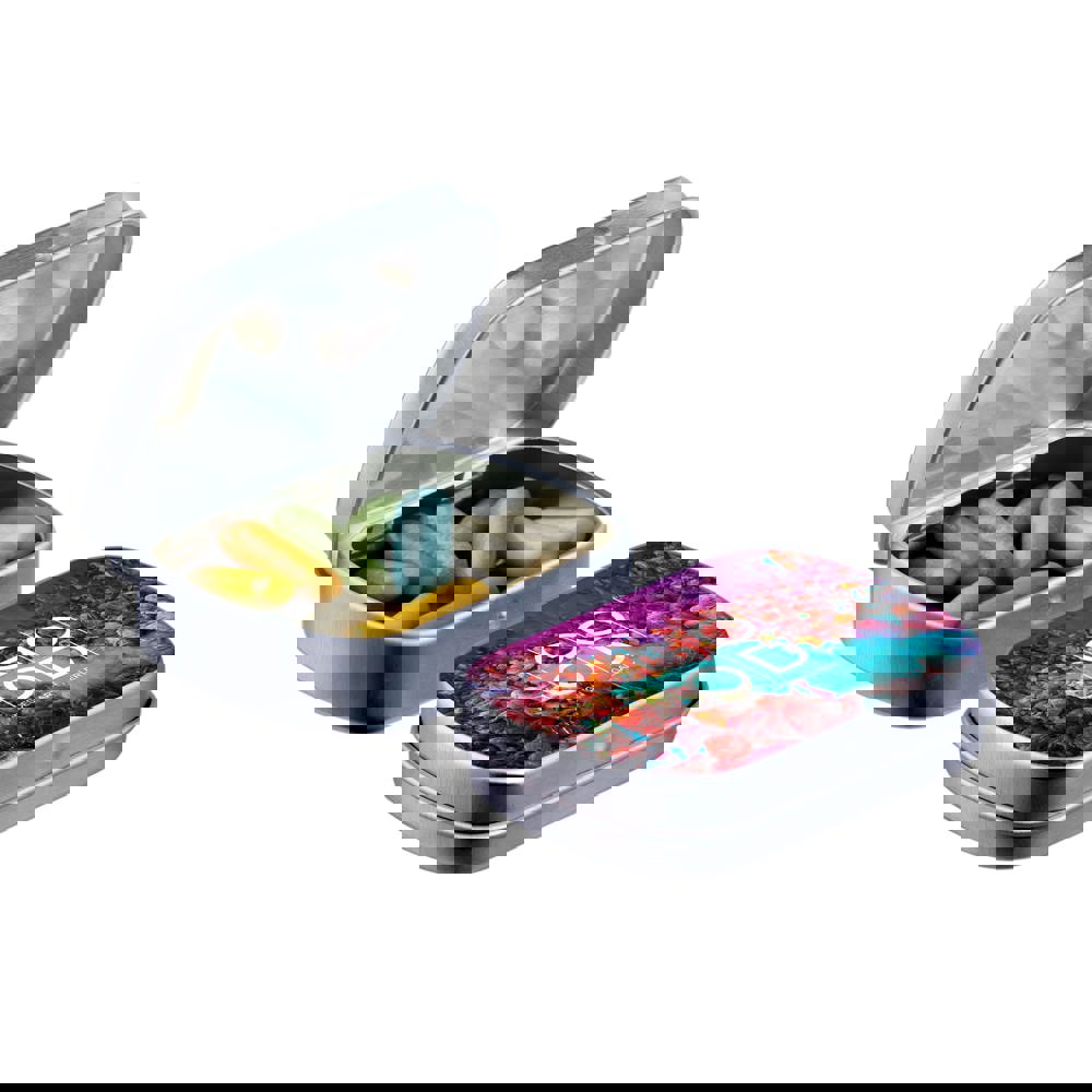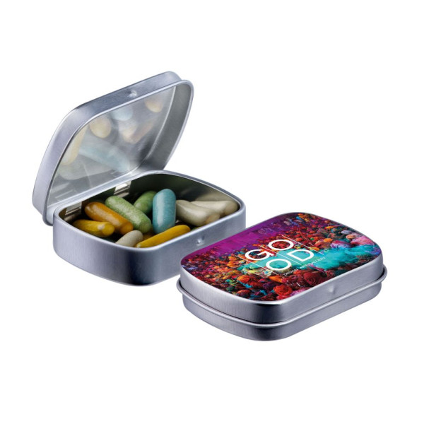 Mini zilver scharnierblikje met ca. 23 gram Dropstaafjes mix, voorzien van een full colour bedrukking. Inclusief ingrediëntensticker en seal.