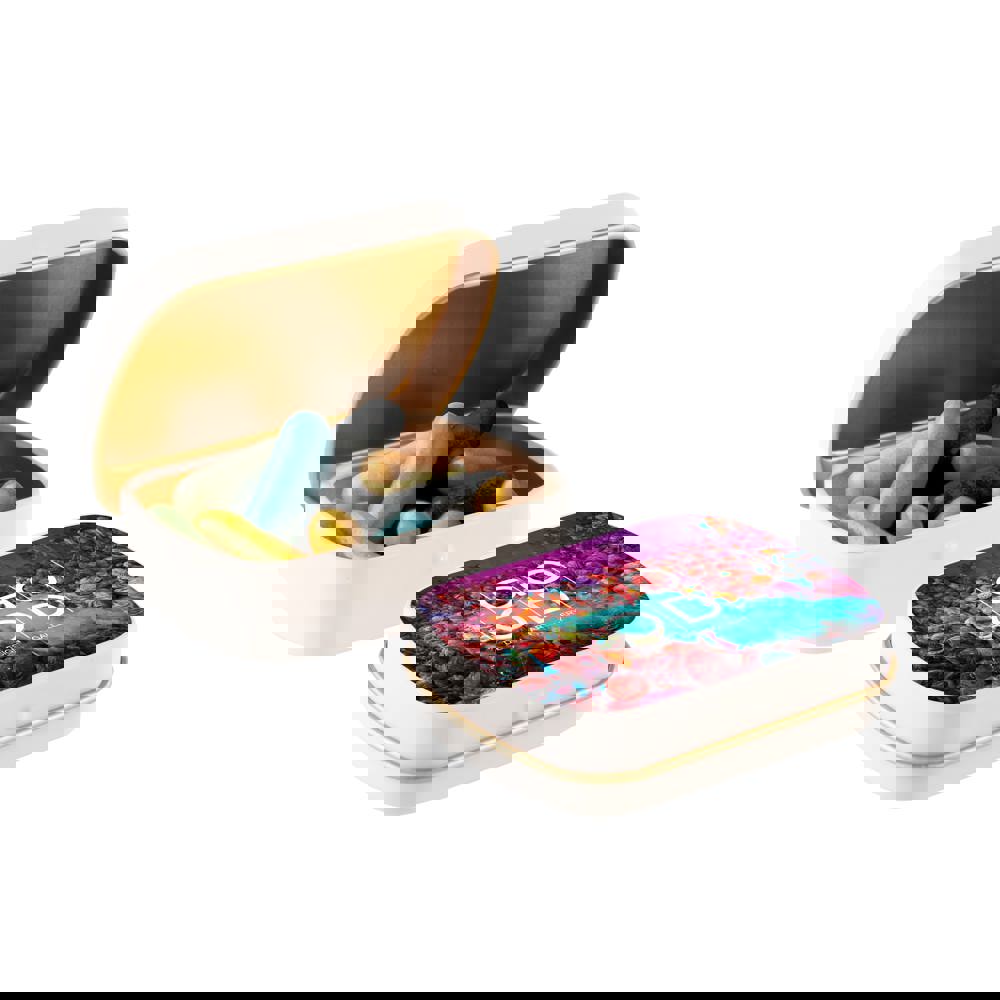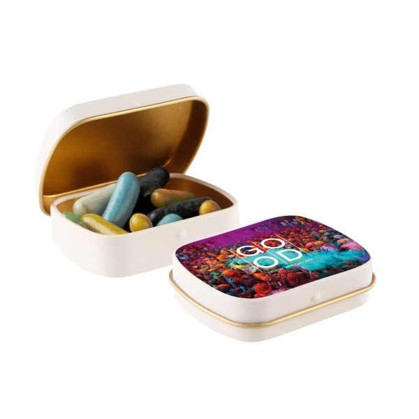 Mini scharnierblikje mat zand met gouden binnenkant en ca. 23 gram Dropstaafjes mix. Voorzien van een full colour bedrukking en inclusief ingrediëntensticker en seal.