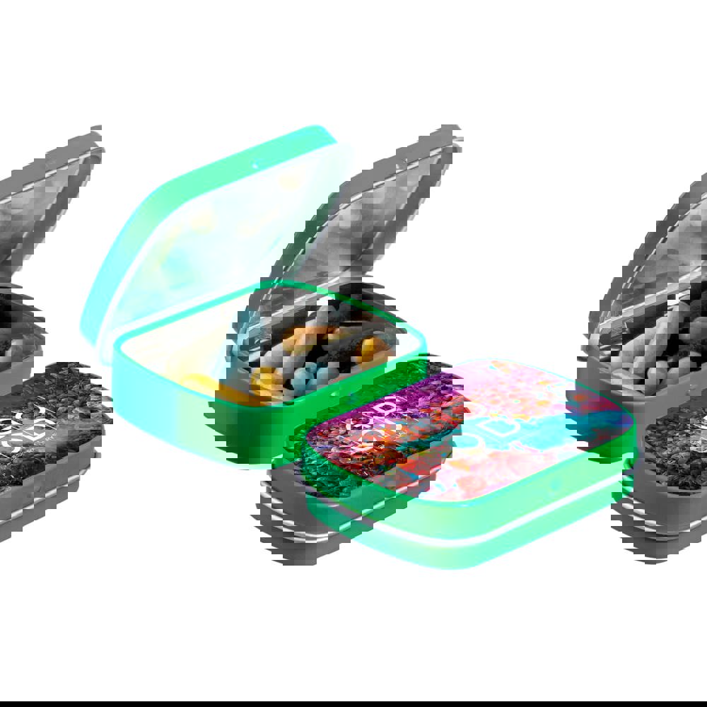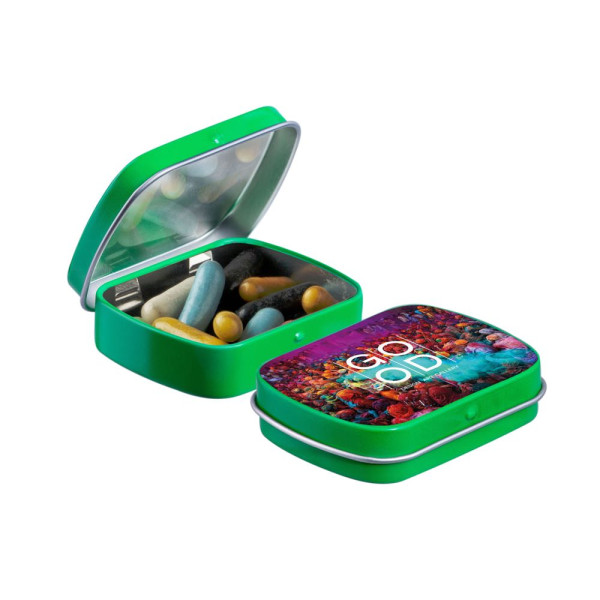 Mini groen scharnierblikje met ca. 23 gram Dropstaafjes mix, voorzien van een full colour bedrukking. Inclusief ingrediëntensticker en seal.