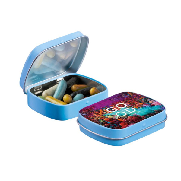 Mini lichtblauw scharnierblikje met ca. 23 gram Dropstaafjes mix, voorzien van een full colour bedrukking. Inclusief ingrediëntensticker en seal.