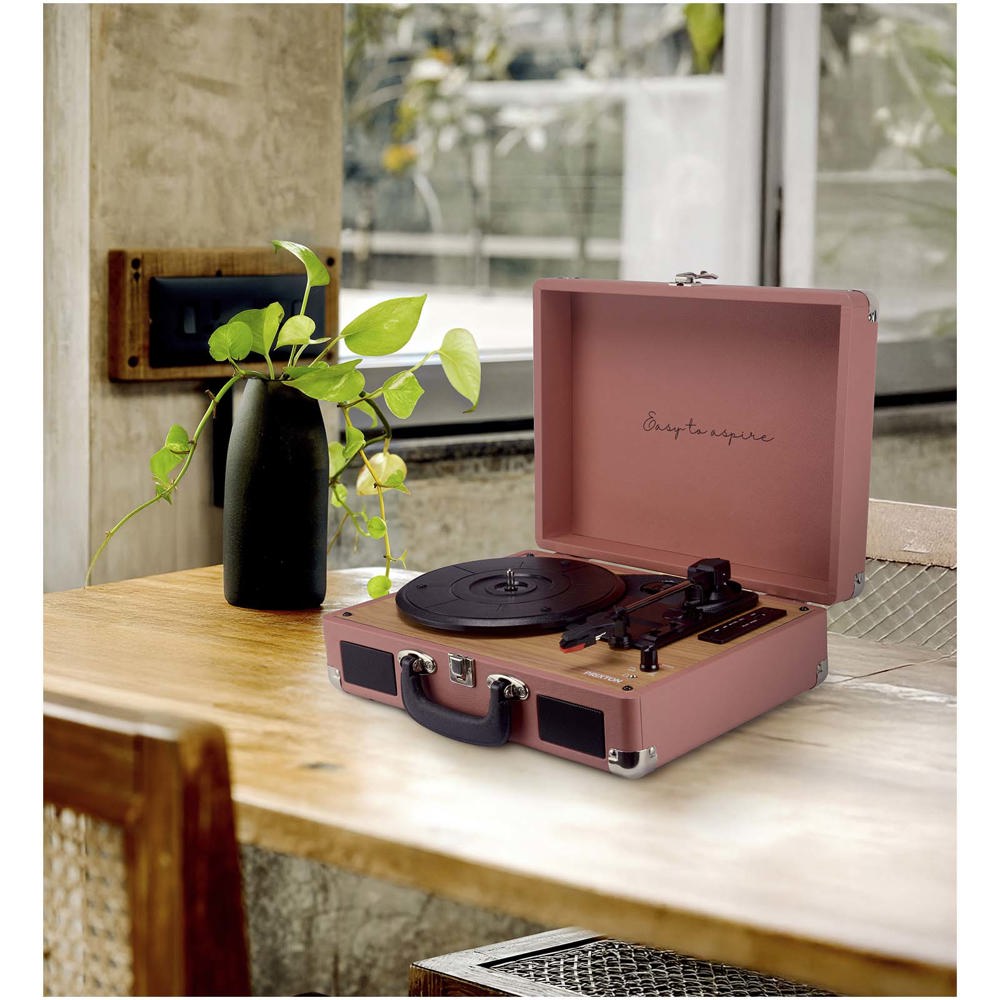 Vinyl- en muziekspeler via bluetooth, USB, TF en FM-radio. Digitaliseert vinyl in WAV-formaat via de USB-ingang en de TF-sleuf. Hij heeft RCA- en hoofdtelefoonaudio-uitgangen. Hij bevat een ruby-potloodnaald om de platen delicaat af te spelen. Ontworpen in de vorm van een aktetas. Hij verbindt een mobiele telefoon met bluetooth en maakt gebruik van de speakerfunctie. Snelheid: 33,3/45/78 rpm. Inclusief rubynaald.