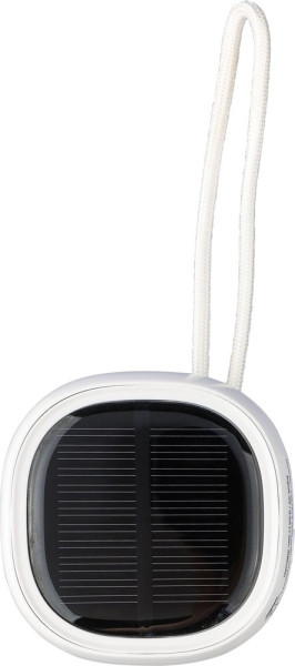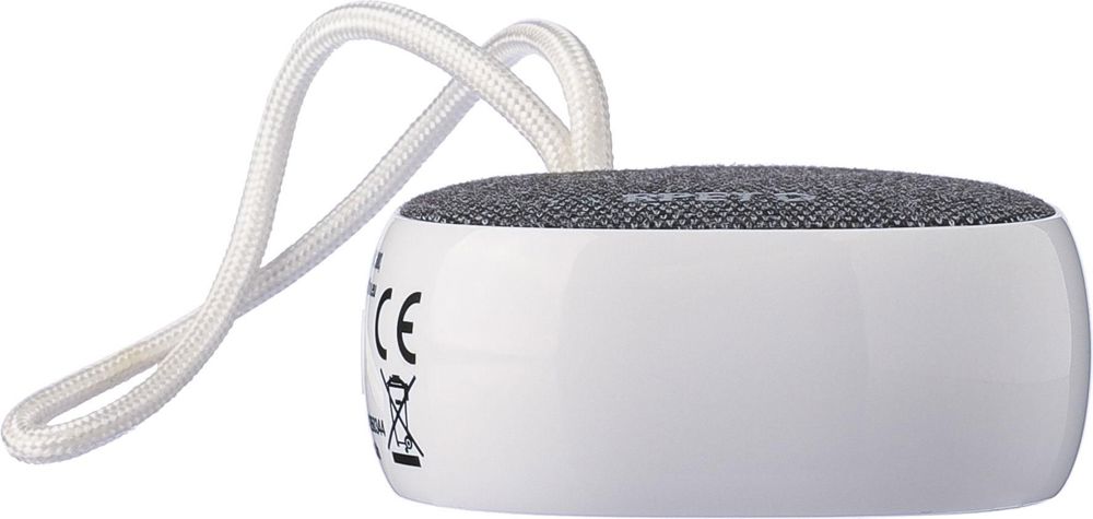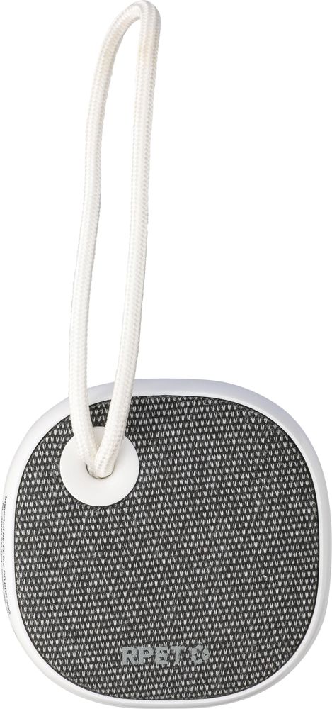 Gerecycled ABS en rPET-stof draadloze speaker met klein nylon draagkoord. Batterijcapaciteit 300 mAh met 3W output, draadloze technologie versie 5.3 en een bereik van 10 meter. Oplaadtijd ca. 2 uur, met een afspeeltijd van 2–3 uur. Inclusief witte USB-C oplaadkabel van 30 cm. Voorzien van rPET-logo op de stof en gerecycled ABS-logo op de zijkant. Individueel verpakt in een bruine kartonnen doos.