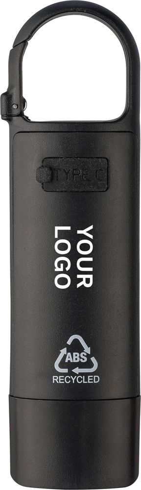 Gerecyclede ABS mini-zaklamp met ingebouwde 200 mAh USB-oplaadbare batterij en karabijnhaak. Voorzien van een front COB-licht en zijkant COB-schijnwerper met drie lichtstanden. Inclusief USB-C oplaadkabel en gerecycled ABS-logo. Individueel verpakt in een bruine kartonnen doos.