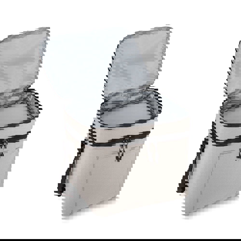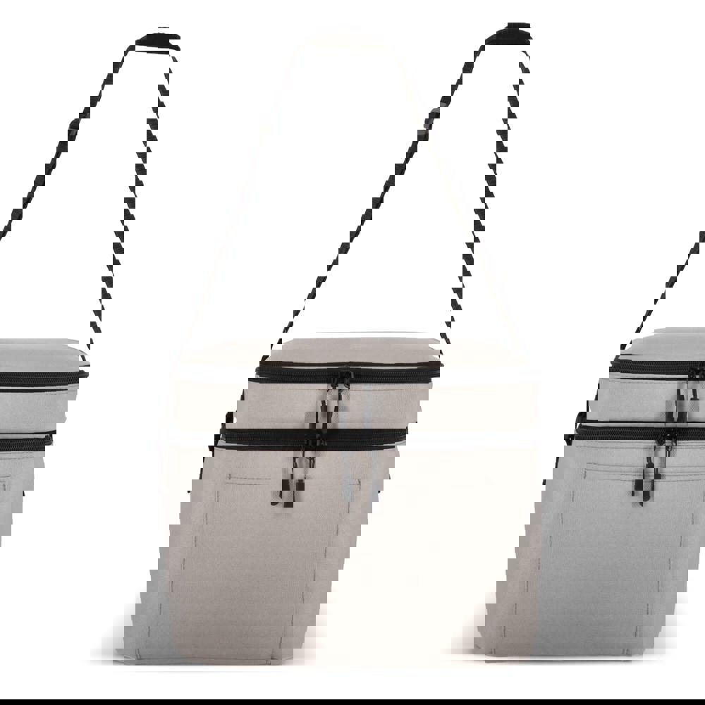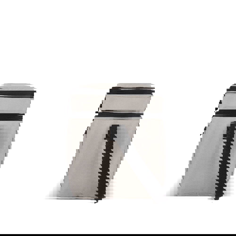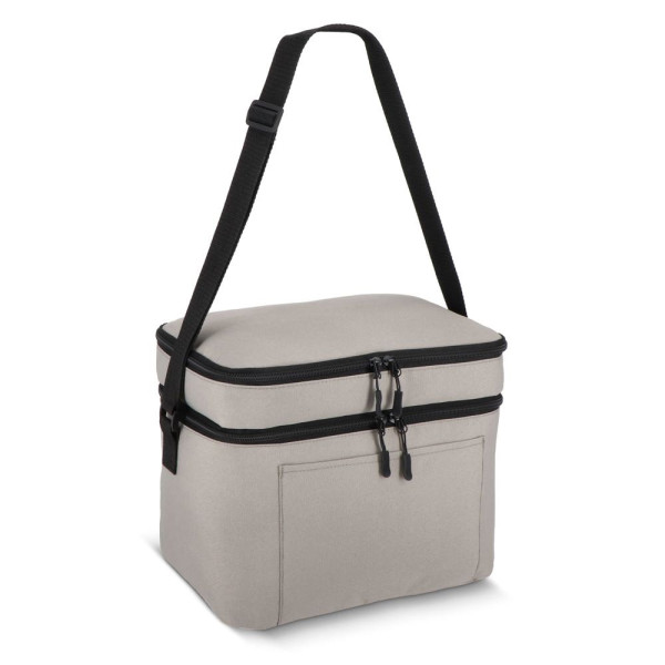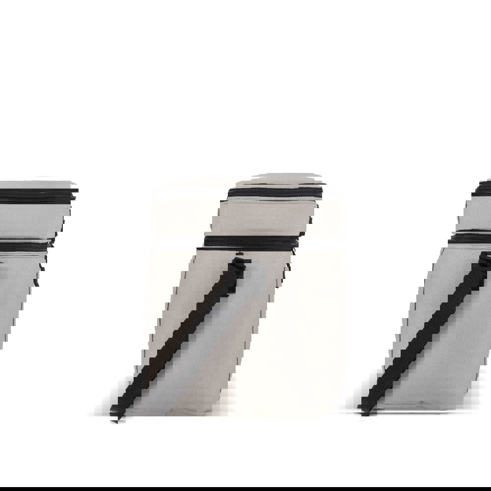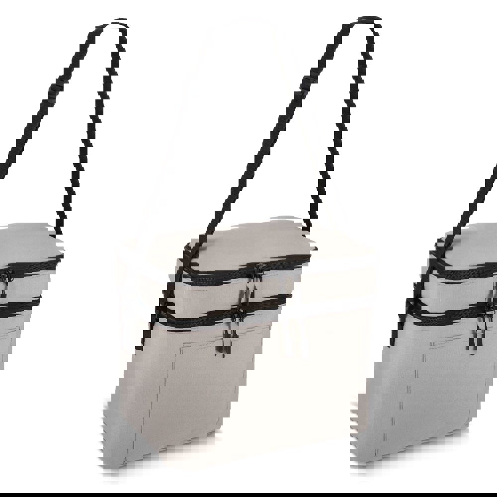 Koeltas van 600D gerecycled PET met een inhoud van 15L, voorzien van een groter ondervak en een kleiner bovenvak. Dankzij de isolerende PEVA-voering kun je warme en koude spullen gescheiden bewaren. De verstelbare schouderriem zorgt voor comfortabel dragen, ideaal voor onderweg.