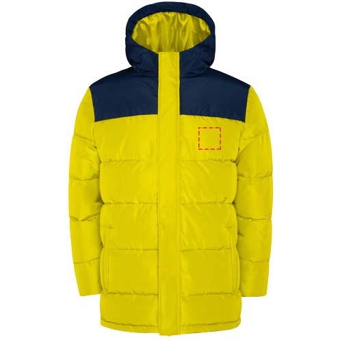 Gewatteerd jack met vaste capuchon. Rits aan de voorkant bedekt met een sluiting. Kinbescherming. Twee zijzakken met rits. Elastische manchetten.