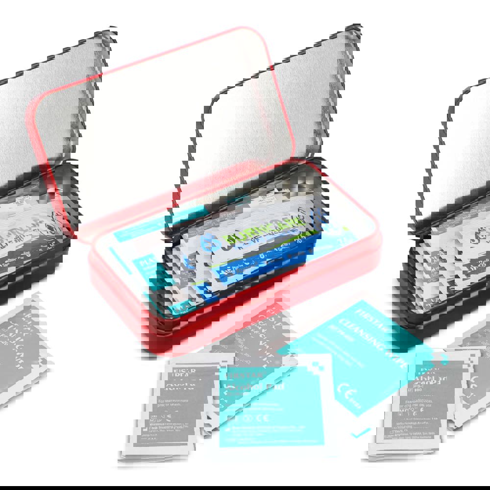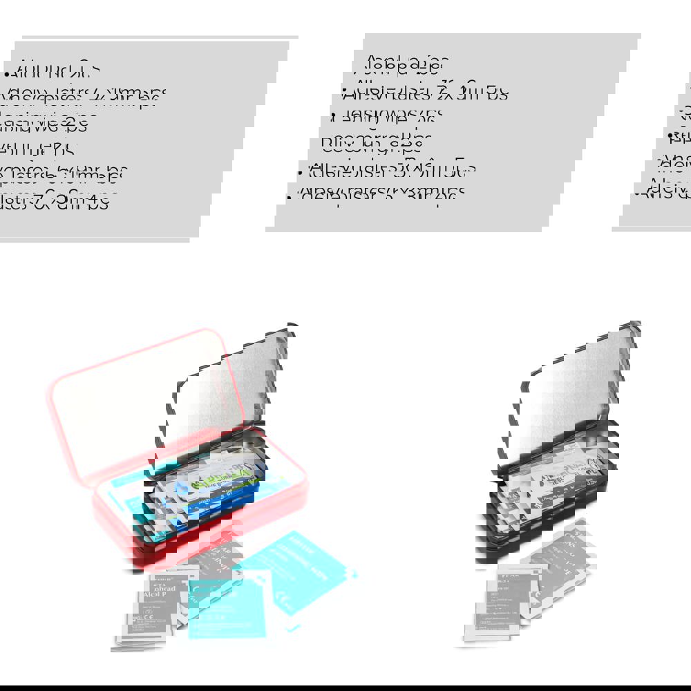 Deze compacte EHBO set wordt geleverd in een stevige blik en voldoet aan Europese normen. Ideaal voor op kantoor, in de auto, tijdens het reizen of als promotioneel item. Inhoud: 2 × alcoholpads, 5 × pleisters 72 × 19 mm, 2 × reinigingsdoekjes, 2 × burn gel sachets, 5 × pleisters 56 × 19 mm, 4 × pleisters 76 × 38 mm.