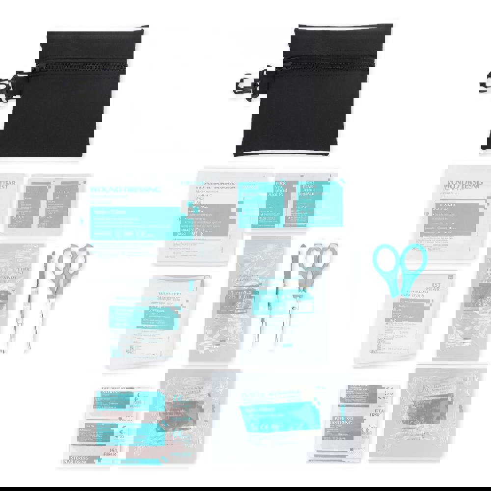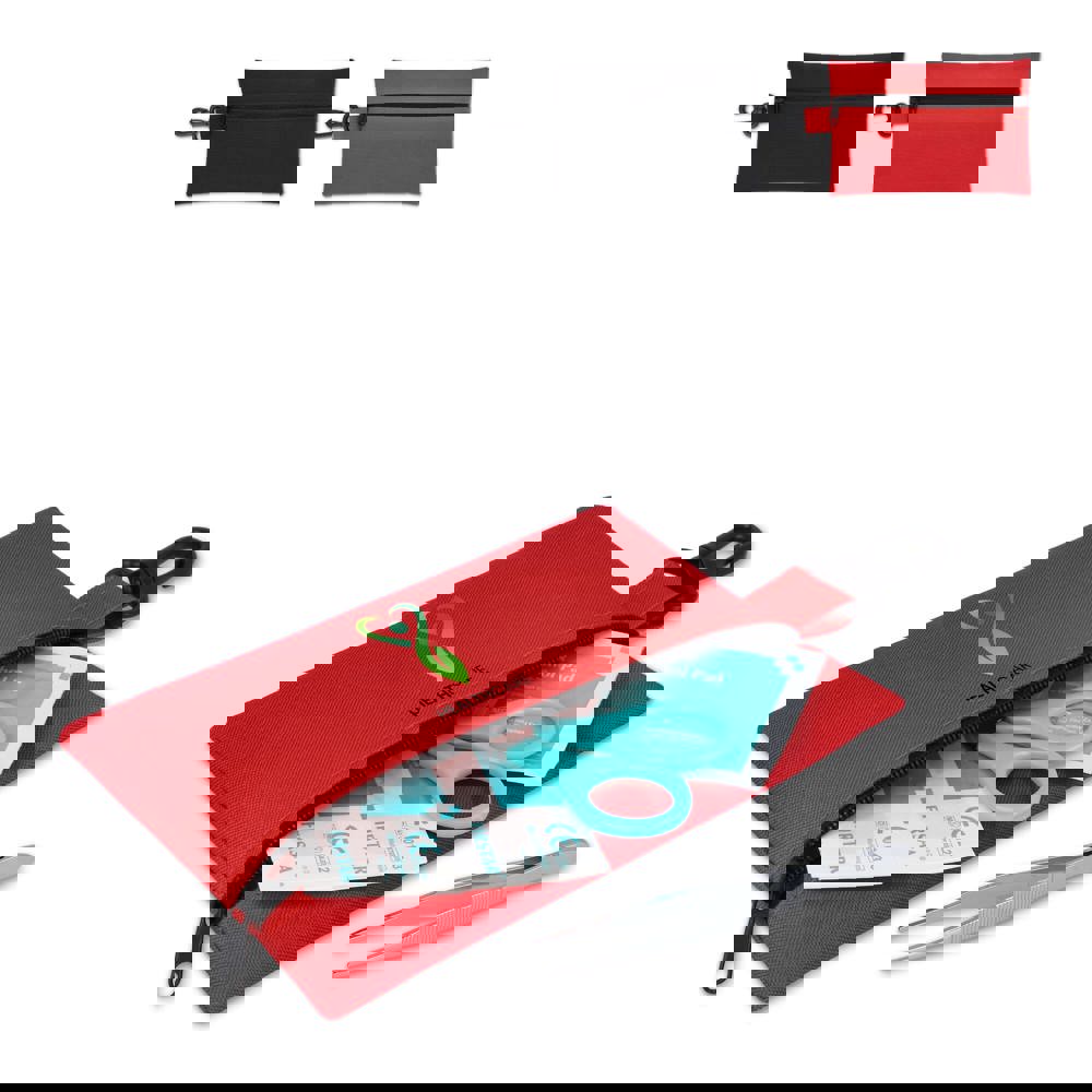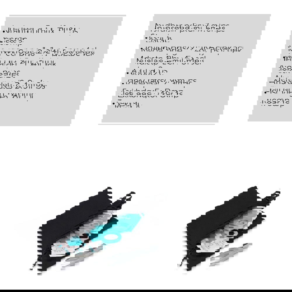Deze EHBO set wordt geleverd in een handige 300D polyester etui met karabijnhaak en voldoet aan Europese normen. Ideaal voor reizen, outdoor-activiteiten of in de auto of rugzak voor kleine noodgevallen. Inhoud: 2 × non-adherente pads 5 × 7.5 cm, 1 × schaar, 1 × pack van 5 non-woven sponzen 2" × 2" 4-laags, 1 × medische tape 1.25 cm × 4.5 m, 2 × alcoholpads, 5 × pleisters 72 × 19 mm, 1 × elastisch crepeverband 5 × 450 cm, 1 × pincet.